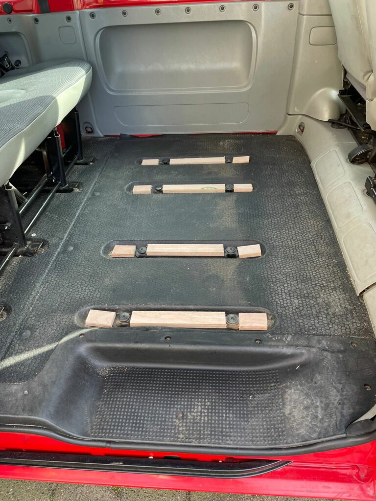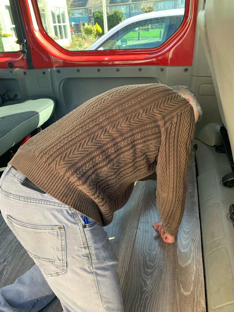 Aangezien de bus een 9 persoons bus was wilde hij 1 bank laten verwijderen. Deze is verwijderd en dan een de gaten opvullen en dan laminaat er overheen.